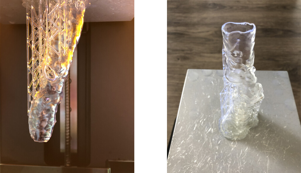W oprogramowaniu PreForm model jest ustawiany do druku, dodawane są struktury podporowe – należy uważać, by nie projektować podpór wewnątrz światła aorty. Gotowy model jest przesyłany do drukarki 3D Formlabs Form 2 i drukowany z żywicy Clear. Druk trwa ok. 4–6 godz. i wymaga średnio 20–30 ml materiału. Po zakończonym procesie obiekt jest czyszczony w automatycznej myjce Form Wash w alkoholu izopropylowym, a później utwardza się go światłem UV w urządzeniu Form Cure. Na koniec usuwane są struktury podporowe.