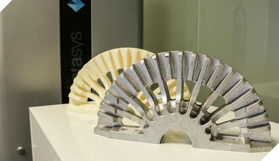 Wydruk, z uwagi na skomplikowaną geometrię, wymagał zastosowania rozpuszczalnego materiału podporowego QSR. Dzięki niemu możliwe było uzyskanie wysokiej gładkości powierzchni tworzonego modelu pod odcisk dla form odlewniczych. Do procesu druku wykorzystaliśmy wzmocniony materiał ABS M-30. Właściwości tego tworzywa oraz osiągi naszej przemysłowej drukarki 3D Stratasys F370 zapewniły jednorodność elementu oraz bardzo dobre odwzorowanie wymiarów.